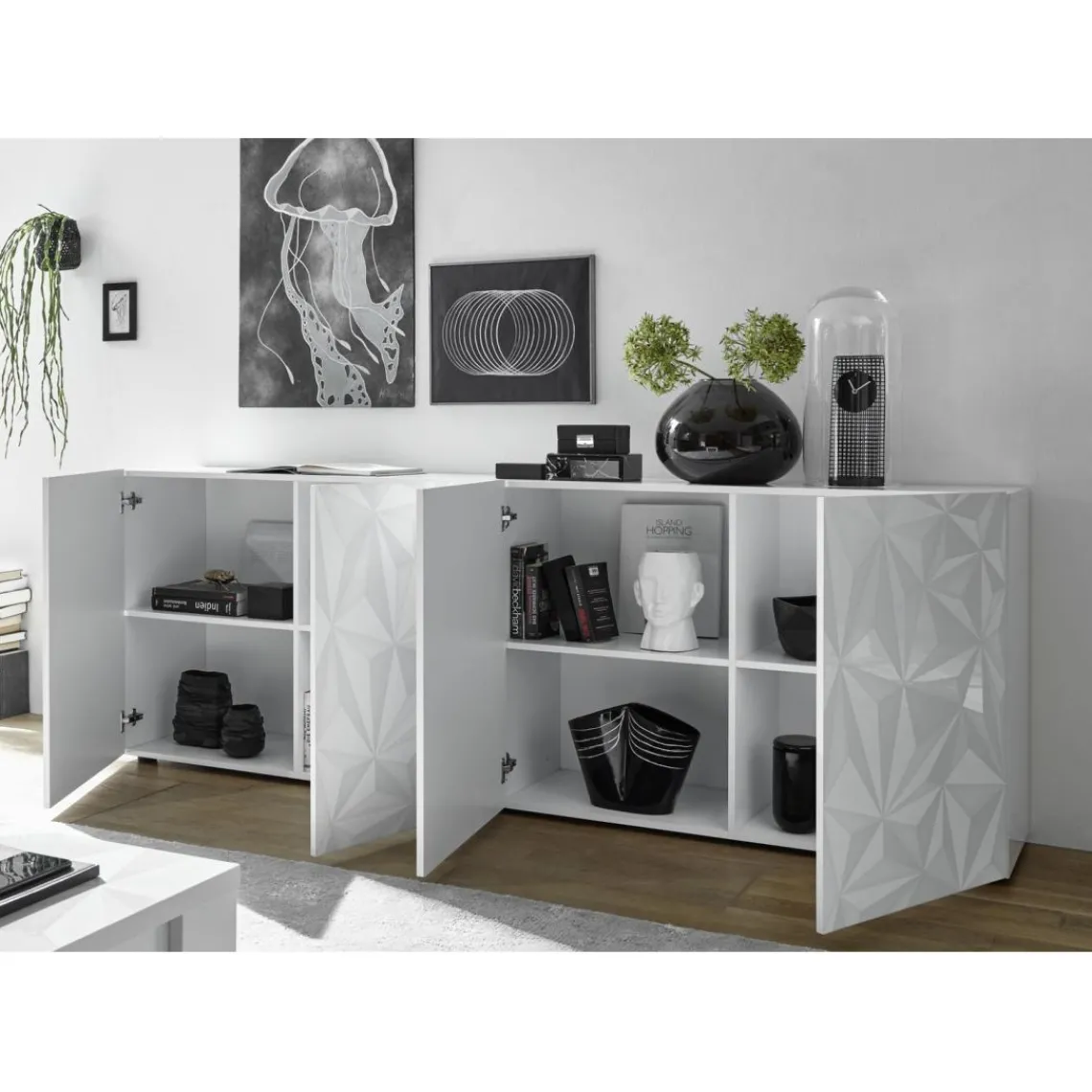 Le buffet 4 portes PRISMA est un choix élégant pour tous les espaces. Avec son laqué blanc brillant sans poignées, il offre une ouverture à battant facile et pratique. À l’intérieur vous découvrirez 8 compartiments dotés d’étagères, parfait pour un rangement optimisé. Ce meuble de style authentique arbore une surface sérigraphiée, témoin de sa fabrication par la marque de qualité supérieure, 3S. x Home.