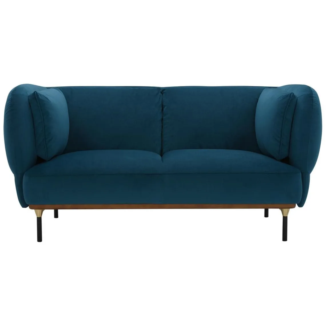 Ce Canapé 2 Places Velours ISEE Bleu Canard plaît par son design raffiné et chic. Aux formes arrondies et enveloppantes, il possède un revêtement généreusement rembourré et des coussins intégrés, assurant un confort sans pareil. Un piétement métallique le complète.