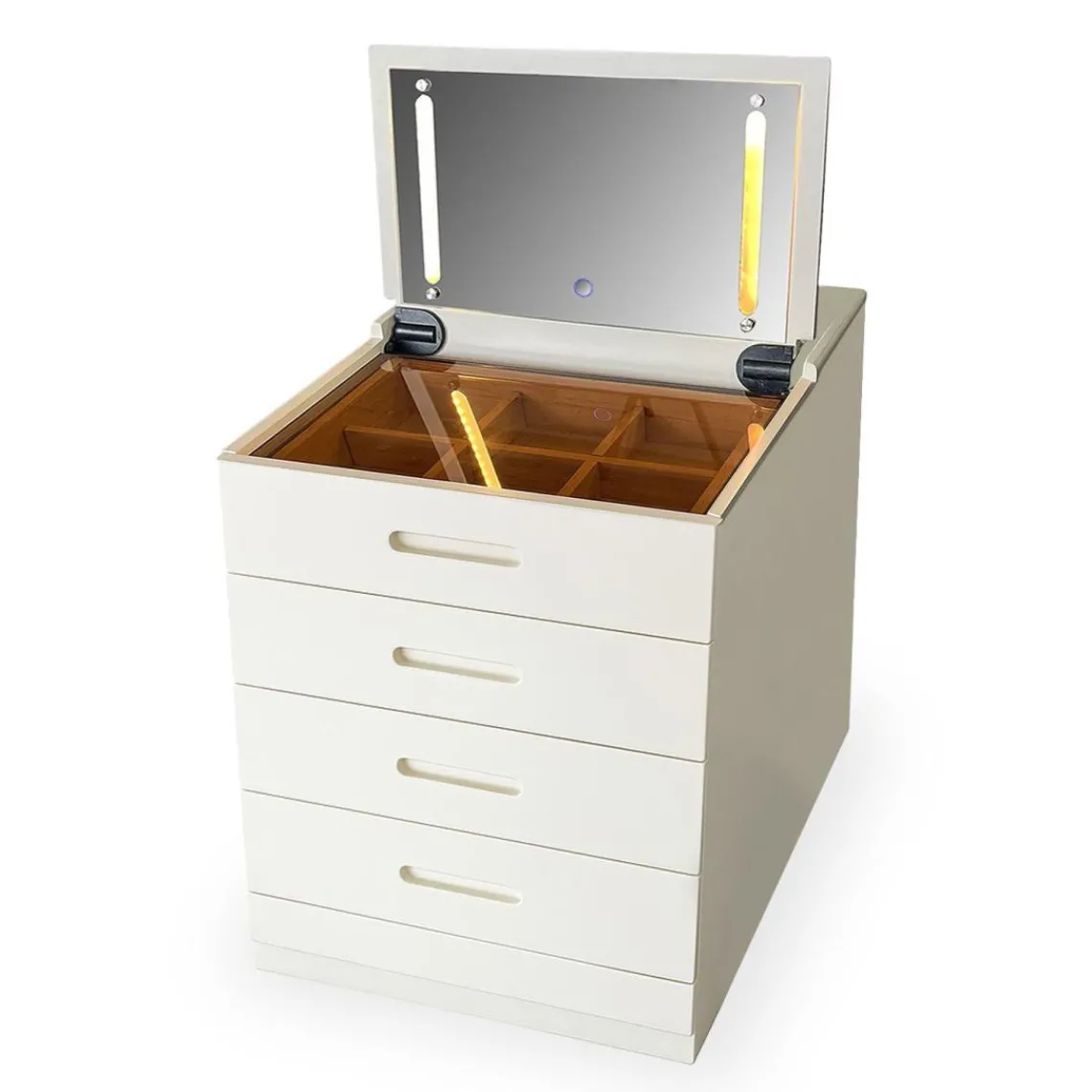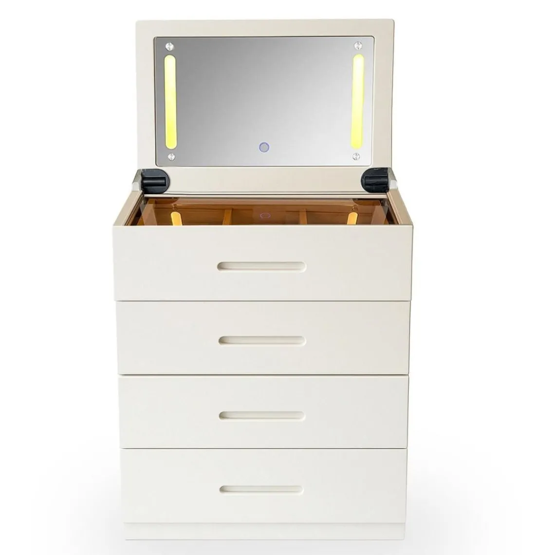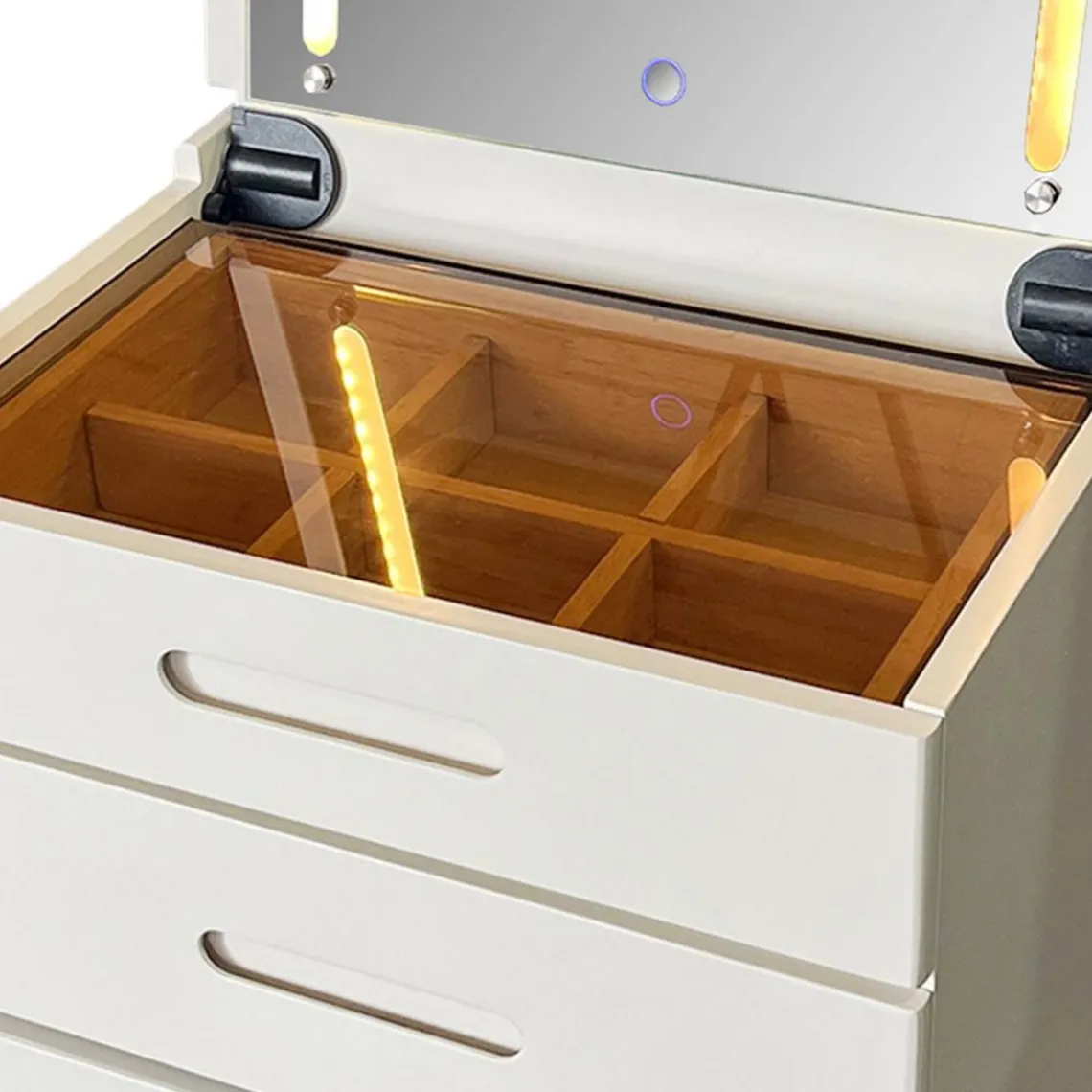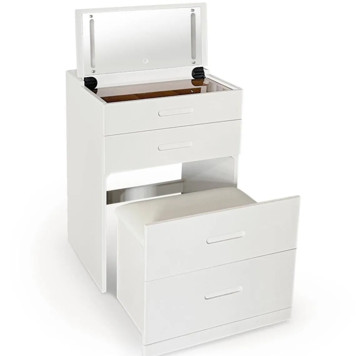 Caractéristiques Coiffeuse compacte avec miroir LED, tiroir et pouf intégré Germina XL Blanc