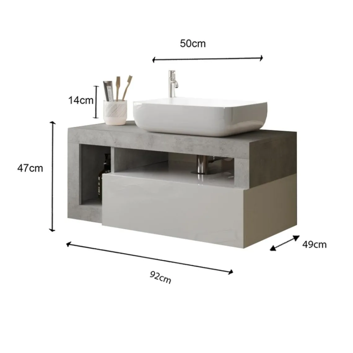 Caractéristiques Meuble salle de bain suspendu Ancona coloris Béton 1 Tiroir et 2 niches vasque à poser 92 cm