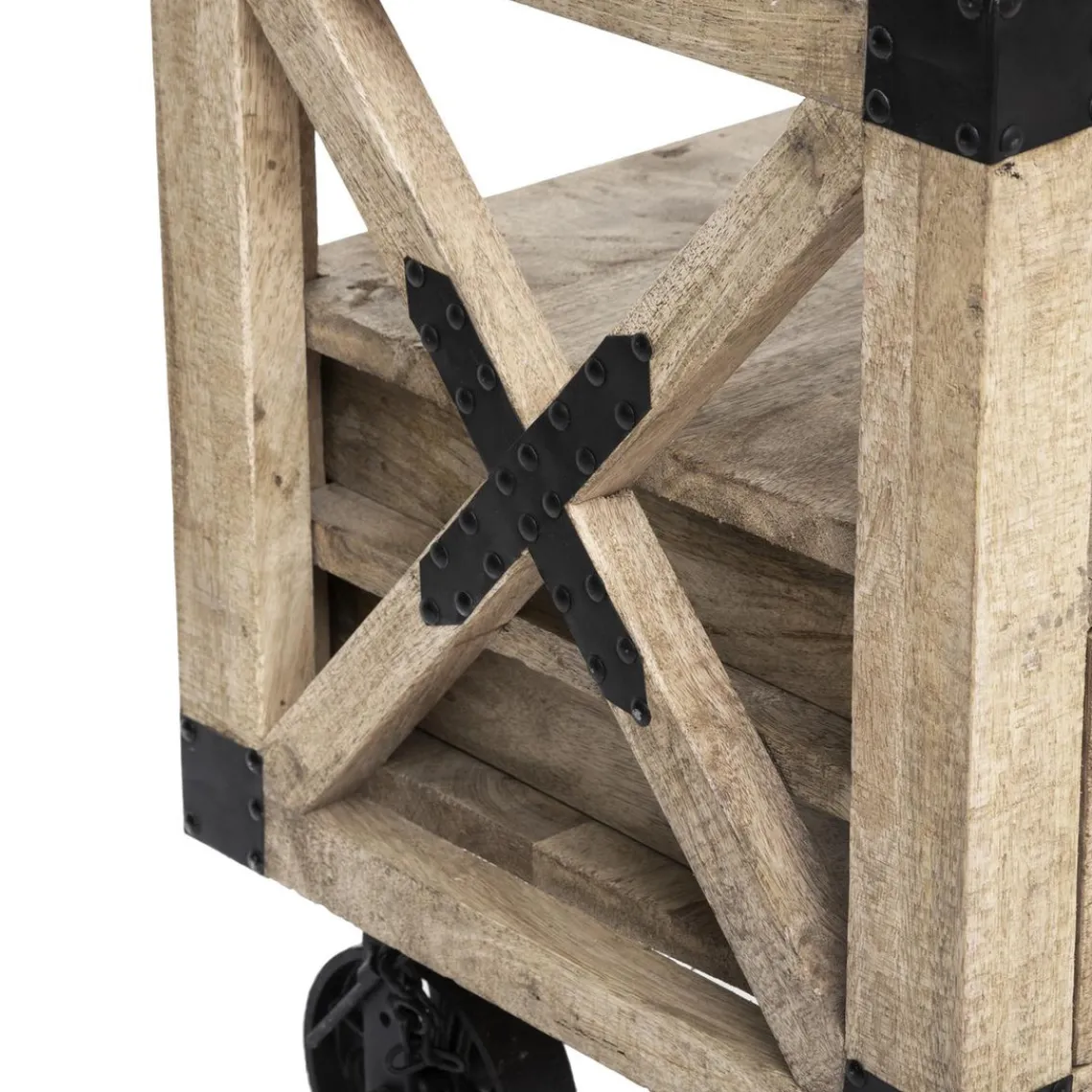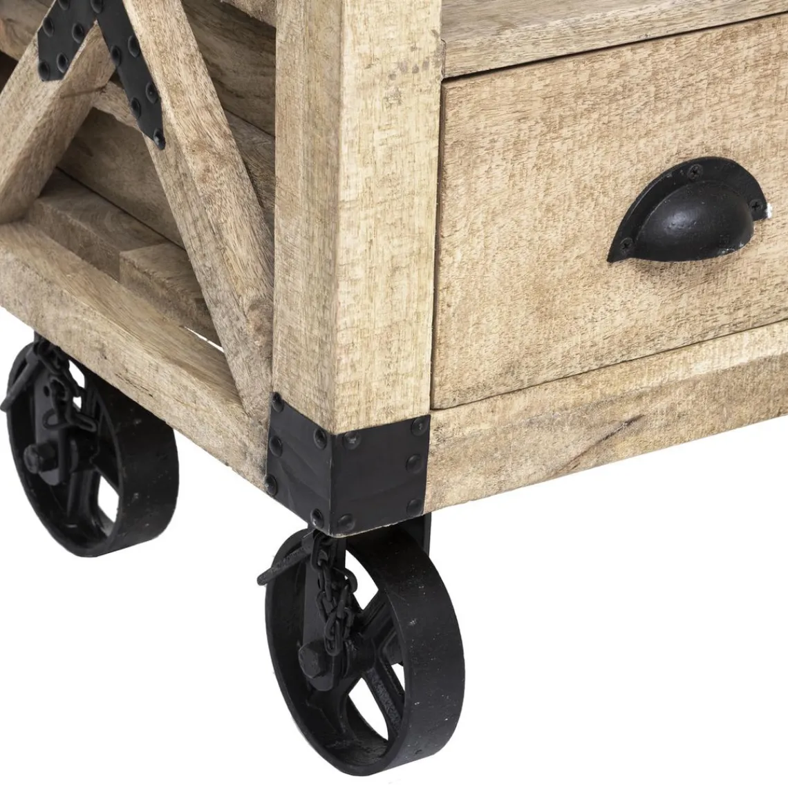 Vous allez adorer l’originalité du design de ce Meuble TV 1 Tiroir SILAS. Sa structure en bois de manguier et son piétement métallique à roulettes attirent de suite les regards.