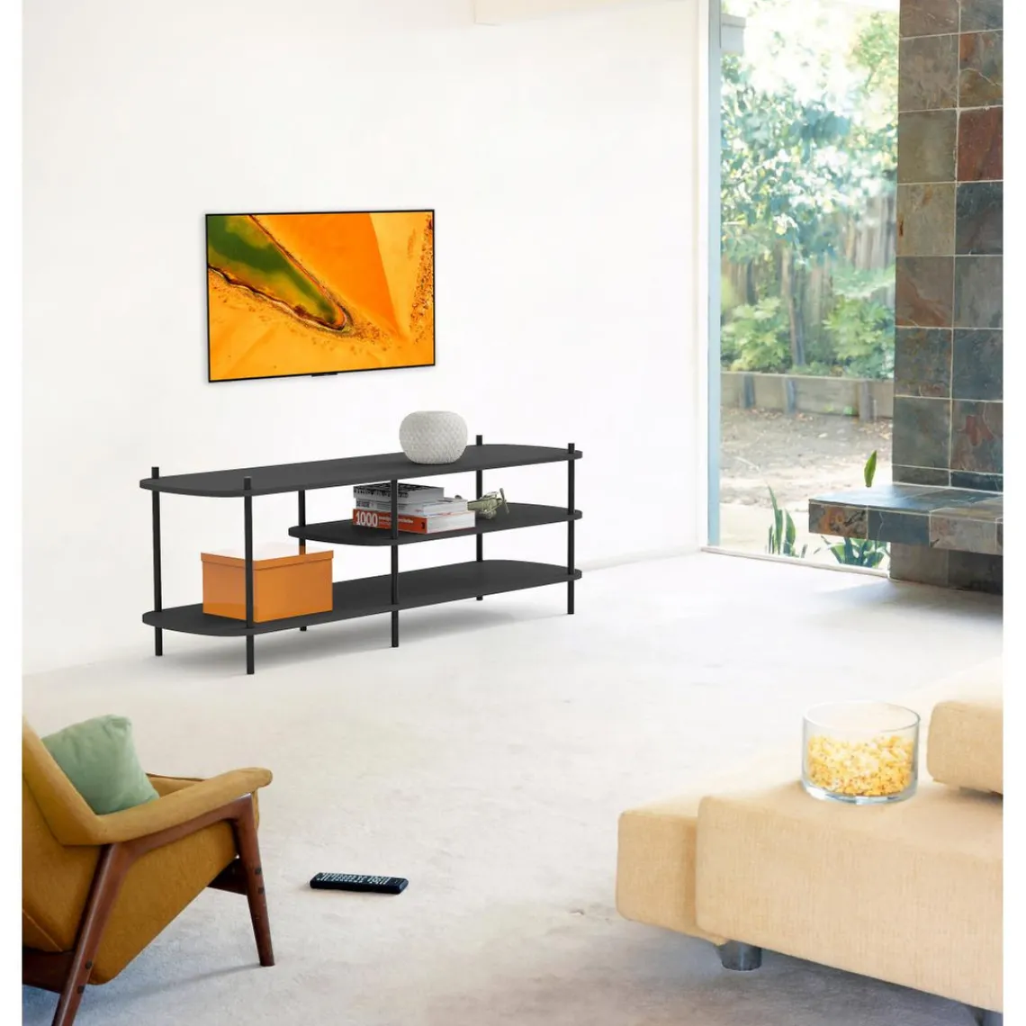 Avec son design monochrome et ses lignes épurés, ce Meuble TV 3 niveaux en métal et en bois noirs trouve sa place dans tous les styles intérieurs.