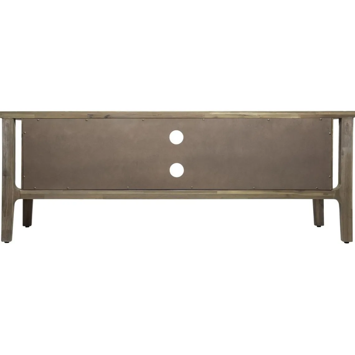 On apprécie l’esprit bohème chic de ce Meuble TV BANILA. Il donne accès à deux étagères centrales et deux portes de chaque côté, cachant chacune un espace de rangement.
