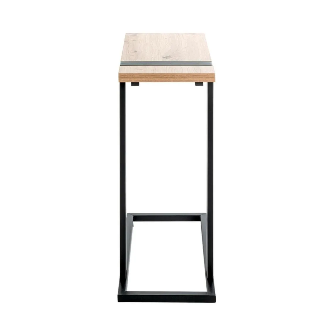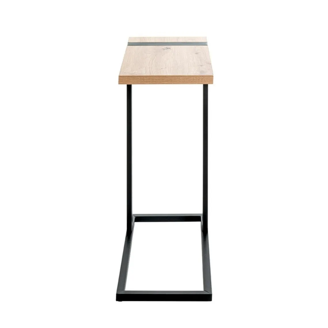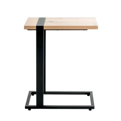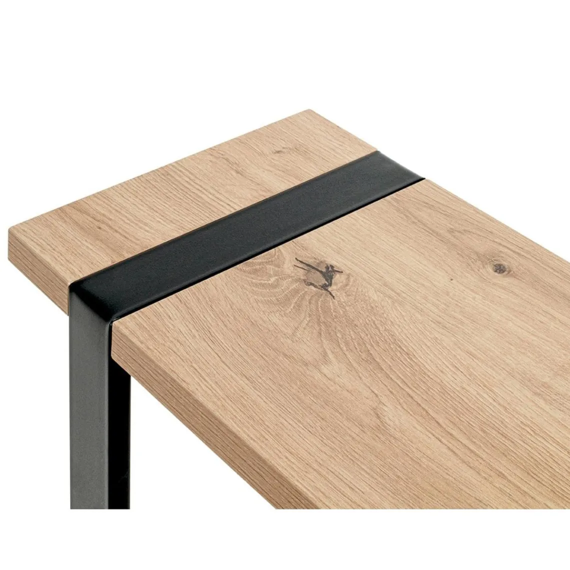 en tube d’acier laqué noir, plateau en panneau de particules décor chêne