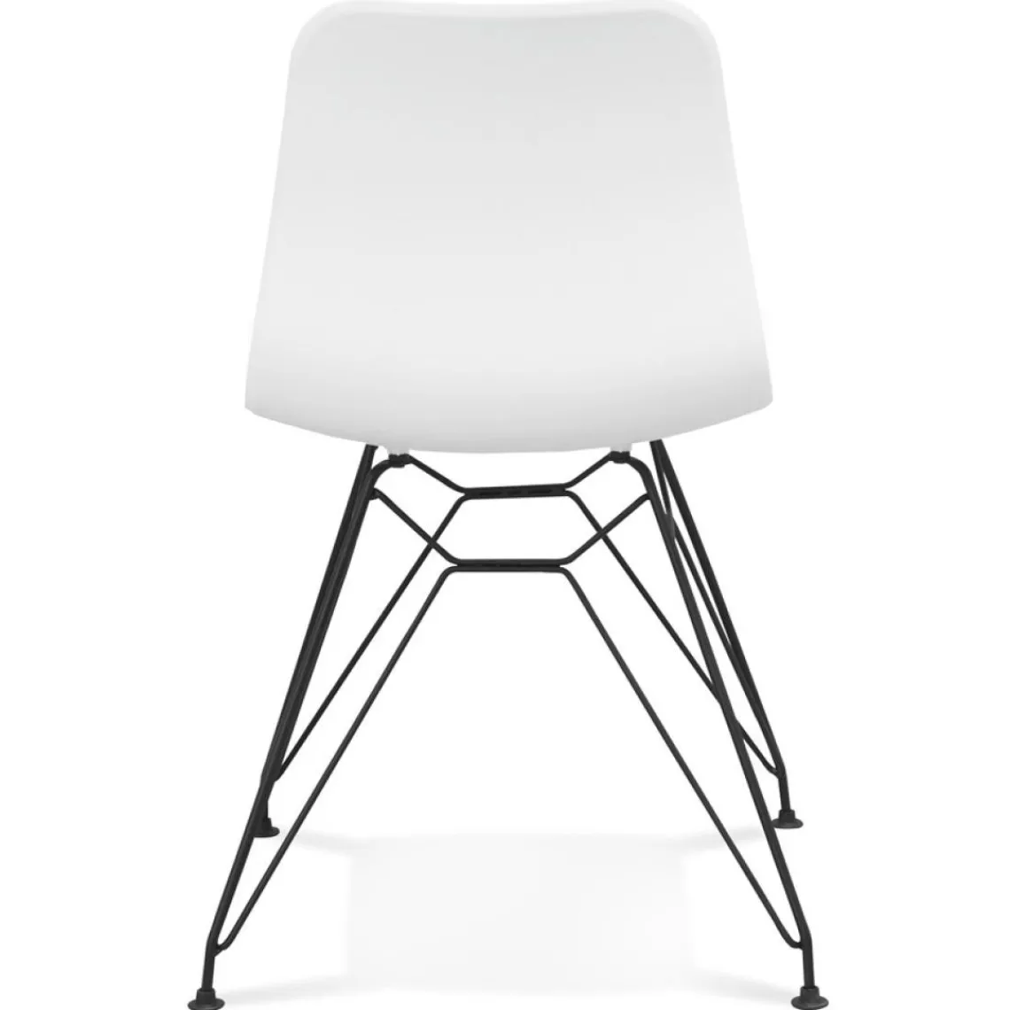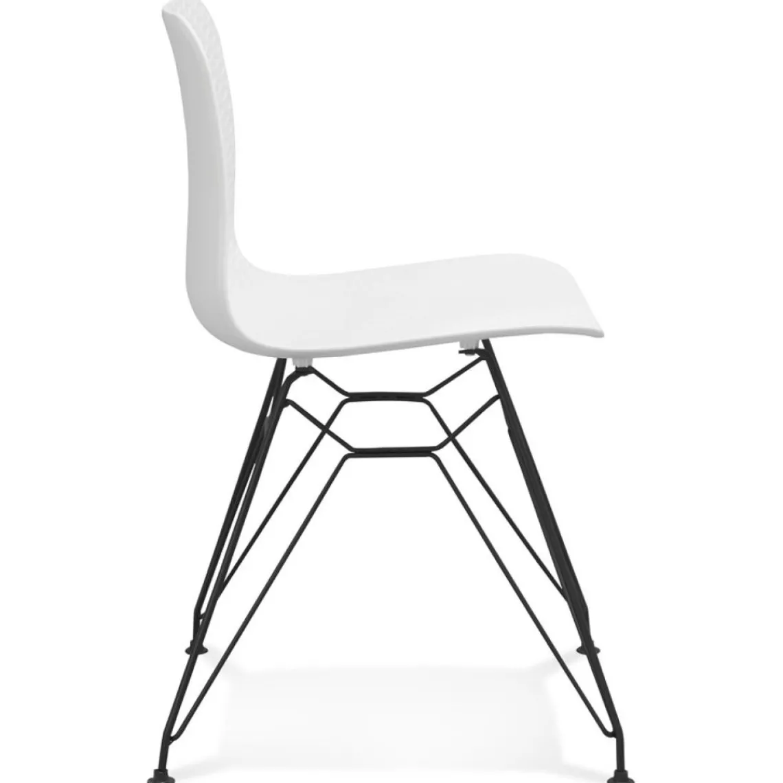 Chaise design avec assise en matière plastique blanche et structure du piètement en métal peint noir proposant un style industriel. De plus, l’assise de la chaise GAUDY est composée de motifs.