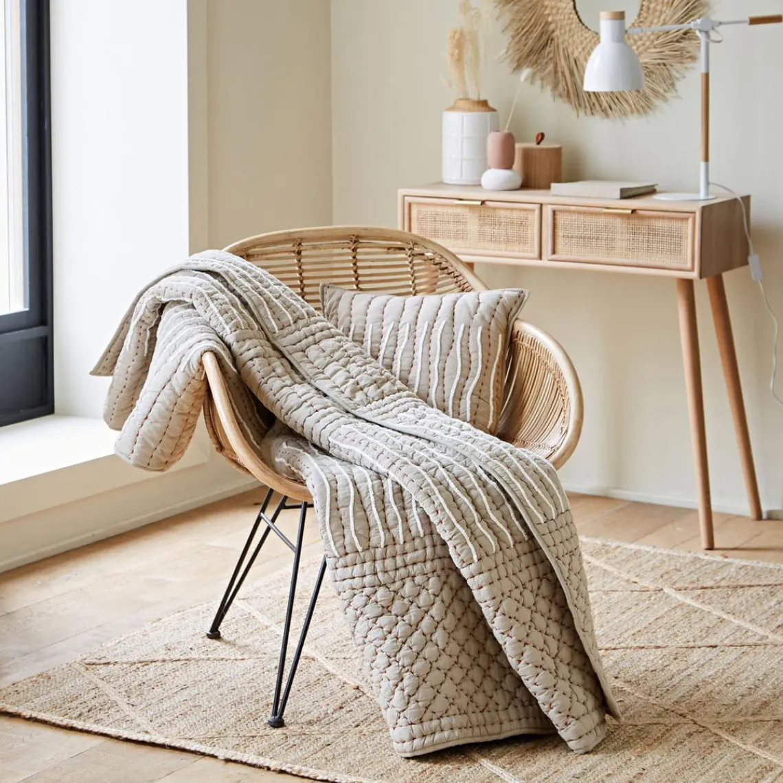 L’Édredon léger GUILLAUME gris de Becquet allie confort quotidien et élégance sobre pour embellir votre chambre tout en vous apportant une douce chaleur. Réalisé en 100 % coton, ce boutis bicolore présente un piquage décoratif fantaisie et une finition en biais qui soulignent la qualité de son design. Le garnissage en polyester 250 g/m² procure une isolation légère, parfaite pour la mi-saison ou comme couverture d’appoint toute l’année. Ce modèle est entièrement fait main, gage d’un soin particulier dans les finitions. Son coloris gris anthracite, à la fois neutre et moderne, s’intègre facilement à toute décoration de chambre, avec un dos uni assorti pour une touche encore plus sobre. Facile d’entretien, il passe en machine à 30 °C.