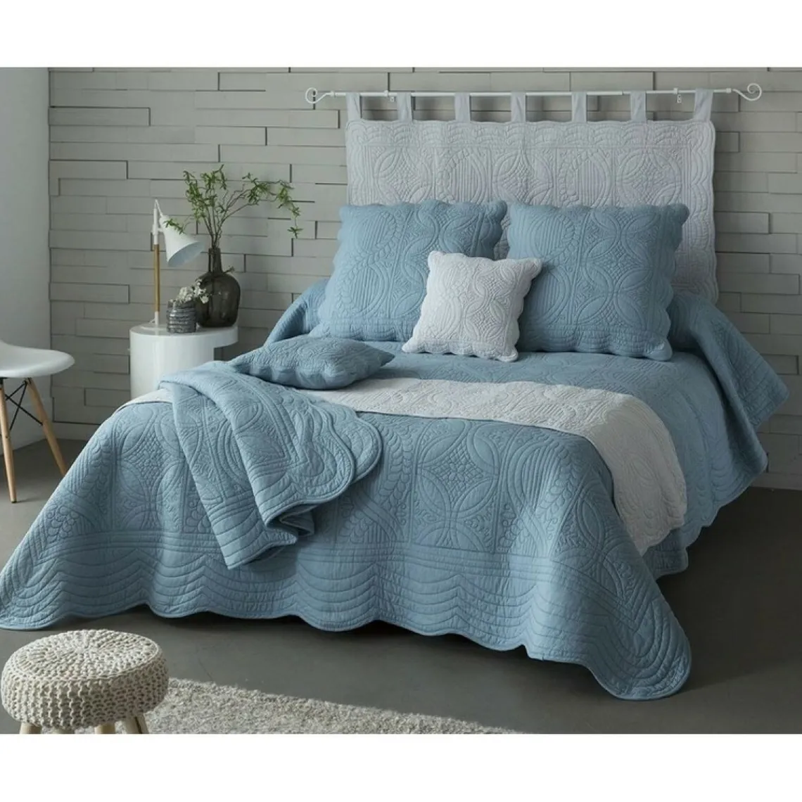 Un très beau piquage et de subtils coloris d&rsquounis pour ces housses de coussin et d’oreiller en boutis de réalisation traditionnelle : 2 épaisseurs de tissu piquées et bourrées de coton. Lavable en machine à 40°.