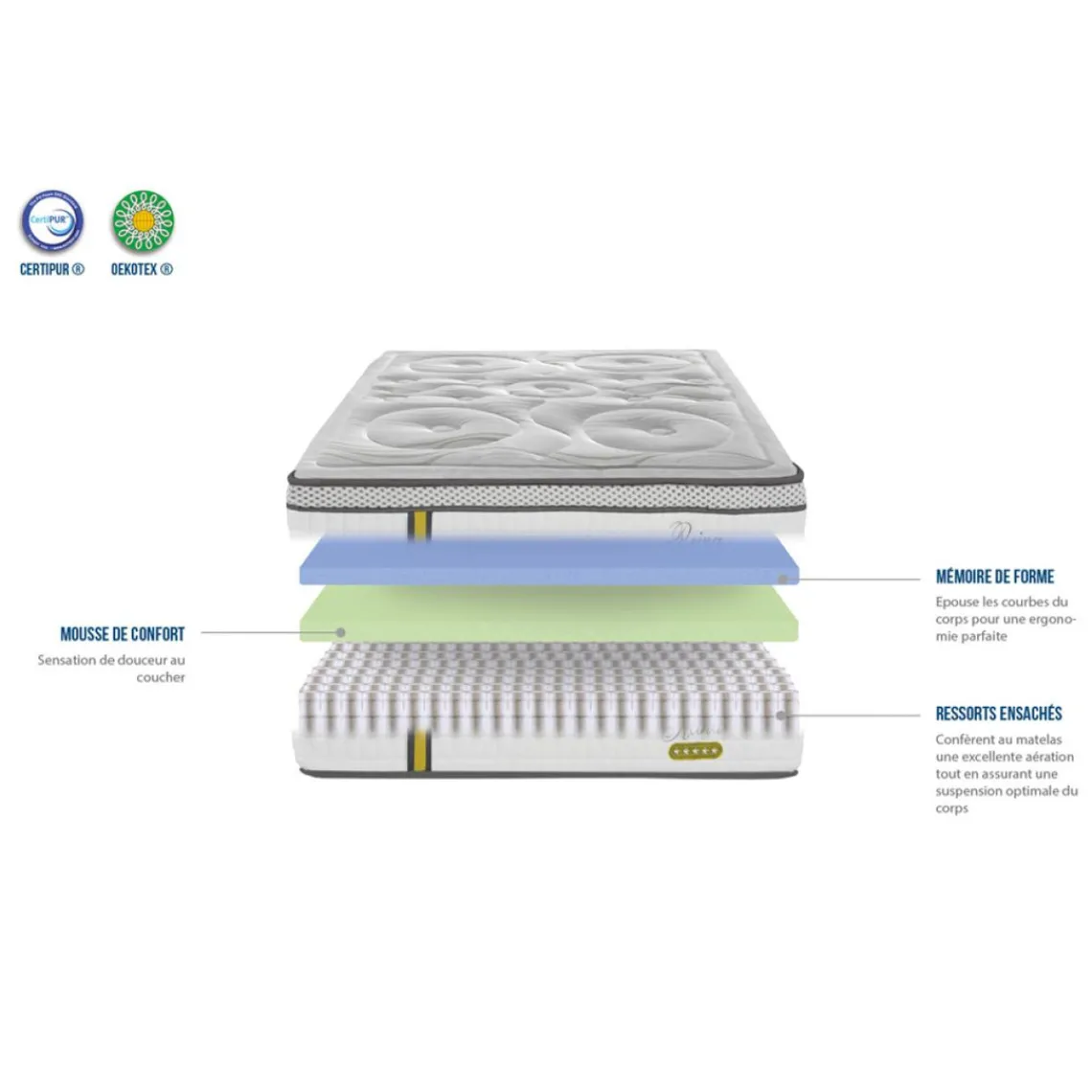 Découvrez ce Matelas Adulte de la marque Bellecour, arborant un style authentique pour un sommeil réparateur. Le matelas Reina 2.0 offre un confort d’exception. Composé de ressorts ensachés et de mousse mémoire de forme, il garantit à la fois un bon soutien du corps et une ergonomie parfaite. Il possède également une bande d’aération 3D qui maintient la surface de couchage à une température agréable pour un bien-être optimal.