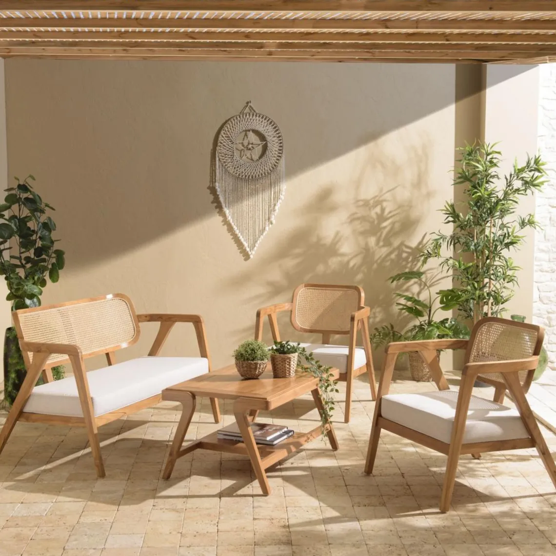 L’Ensemble canapé 2 places 2 fauteuils et 1 table basse FLORES est un sublime produit de la marque MACABANE. Arborant un magnifique Marron, chaque pièce de cet ensemble est conçu dans un mélange harmonieux de matières nobles et robustes : Teck, Rotin et Polyester. Grâce à son design raffiné, cet ensemble sublime votre séjour avec élégance et confort. Sa table basse épurée complète crée un espace d’accueil chaleureux et convivial.