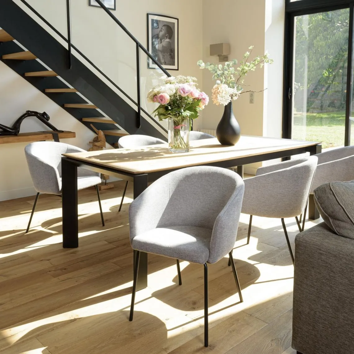 Découvrez le Lot de 2 chaises MACABANE. Son style authentique séduit instantanément. Son design élégant intègre une association harmonieuse de teintes douces et lumineuses. Les lignes épurées, associées à un revêtement en tissu gris clair, subliment son allure. Les pieds en acier noir apportent une touche de sophistication. Faites le choix d’un fauteuil à la fois confortable et chic pour votre espace de vie.