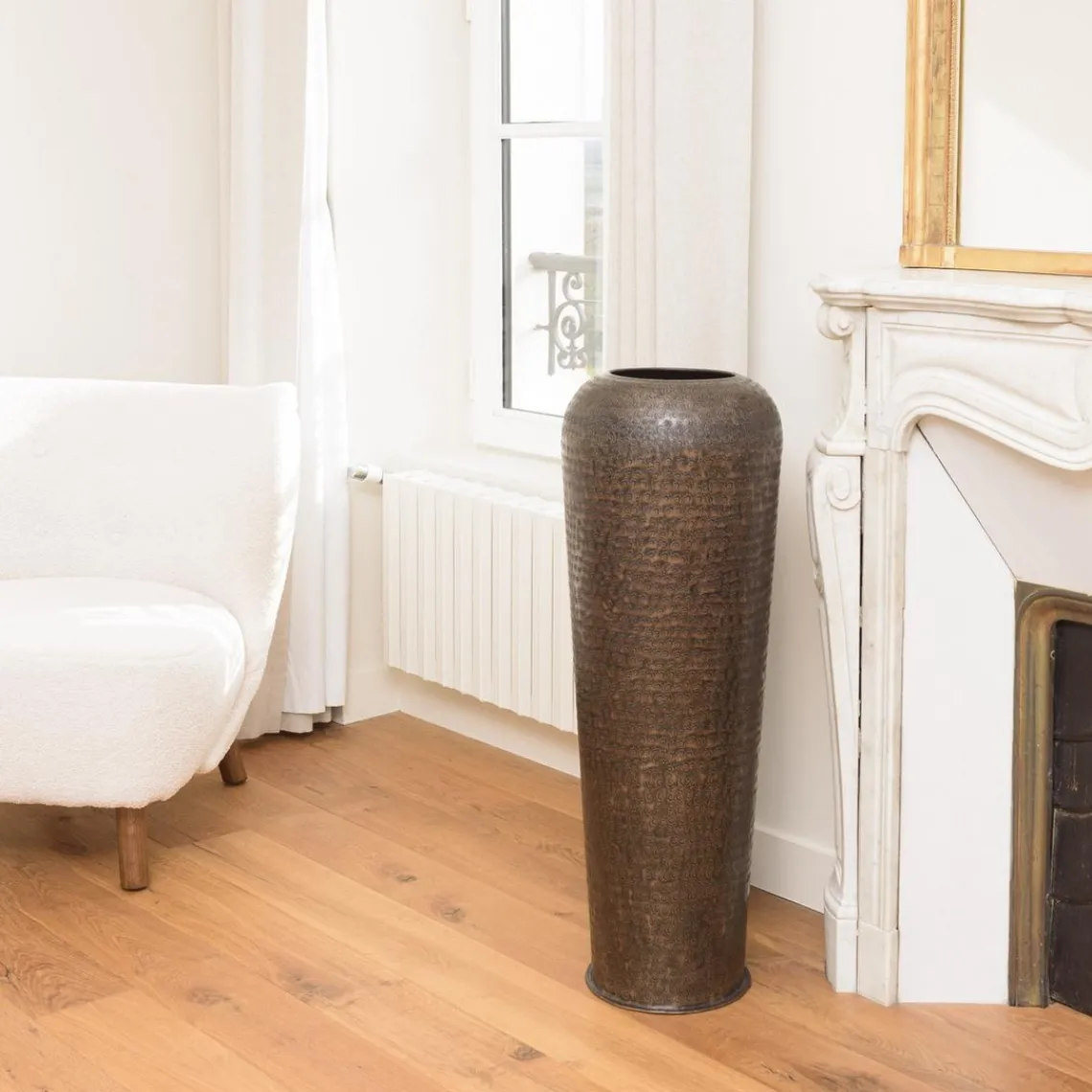 Ce sublime vase MACABANE se distingue par son allure exceptionnelle. D’une hauteur de 88cm, il a une largeur et une profondeur de 31cm offrant une parfaite symétrie. La gravure raffinée sur toute la surface séduit par sa beauté. Sa couleur cuivre noir antique contraste subtilement avec le dessin géométrique gravé en relief. Ce vase couleur cuivre noir sera un ajout remarquable à n’importe quel décor contemporain ou traditionnel.