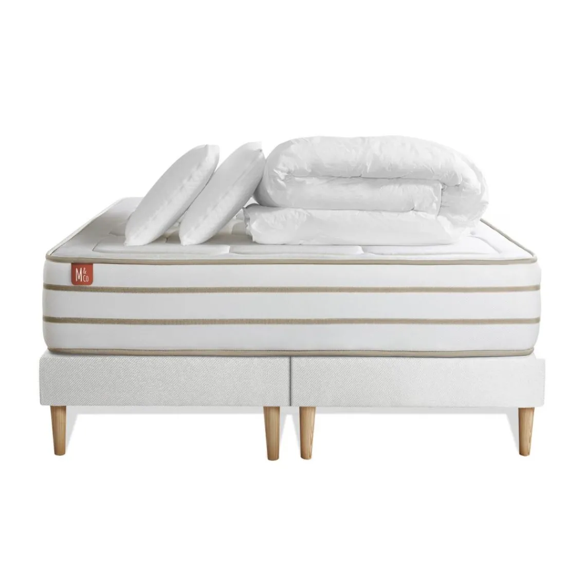 Découvrez le pack prêt à dormir « LE DOUILLET » de la marque Marmottes & Co. Composé d’un matelas à mémoire de forme BioVisco, de deux sommiers habillés d’un tissu de couleur blanc et d’une couette douillette. Ce pack comprend également deux oreillers assortis au reste de l’ensemble. Optez pour un degré de confort inégalé avec ce pack au style authentique, idéal pour toutes les chambres en quête d’élégance et de confort. Les détails du tissu, visible sur l’image, apportent une finition parfaite à ce produit de haute qualité.