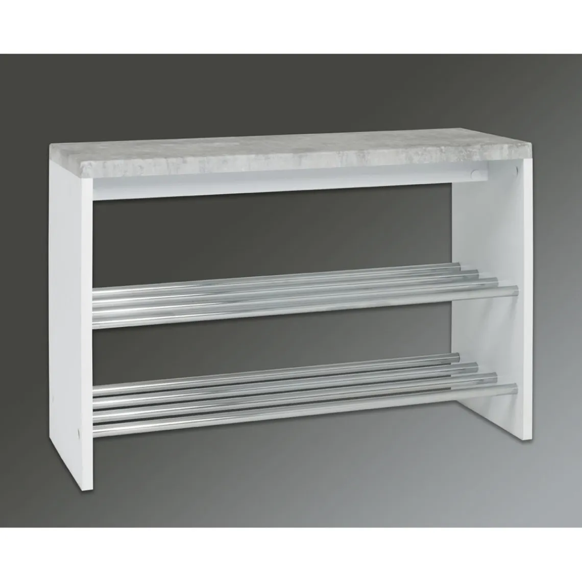 Le Banc de rangement chaussure plateau décor béton trois niveaux de la marque 3S. x Home est un meuble à chaussures pratique et raffiné. Mesurant 55 cm de hauteur et 81 cm de longueur, sa taille est idéale pour optimiser votre espace. Il est conçu en MDF décoré en blanc, donnant une allure élégante à votre intérieur. Le meuble est accentué par des plateaux en MDF à l’optique béton ainsi qu’une pose à chaussures chromée, ajoutant une touche contemporaine à sa conception.