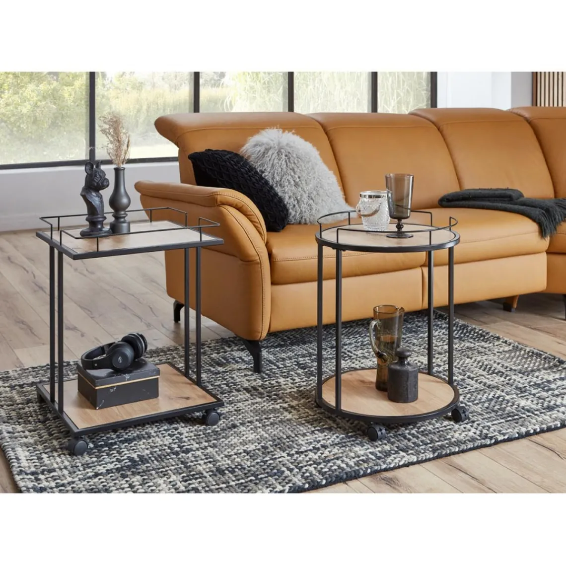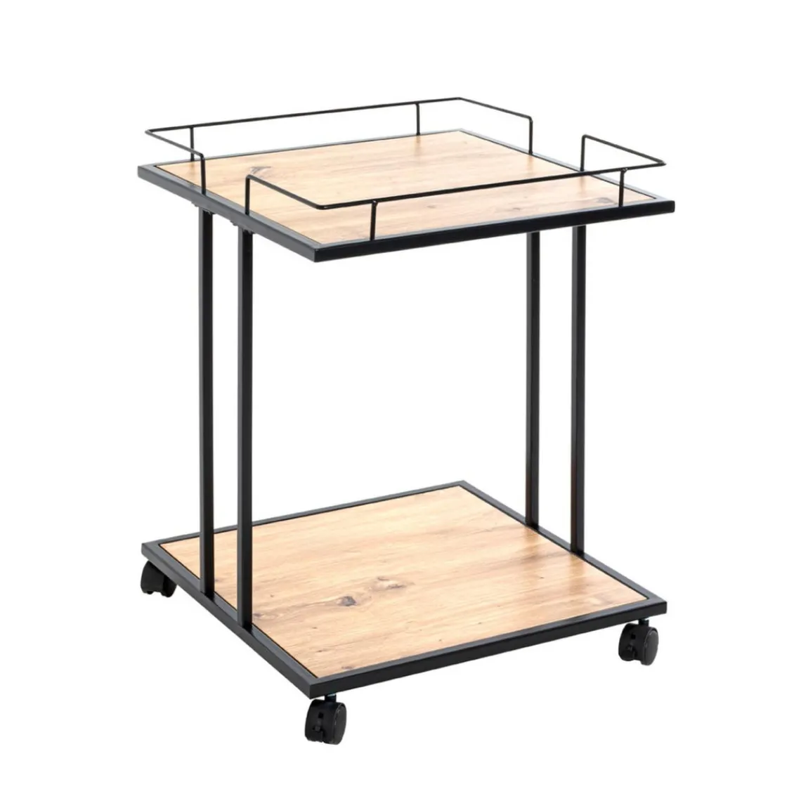 Matières : MDF, mélamine, métal en tube d’acier laqué noir, plateaux en MDF décor chêne (mélamine), sur roulettes