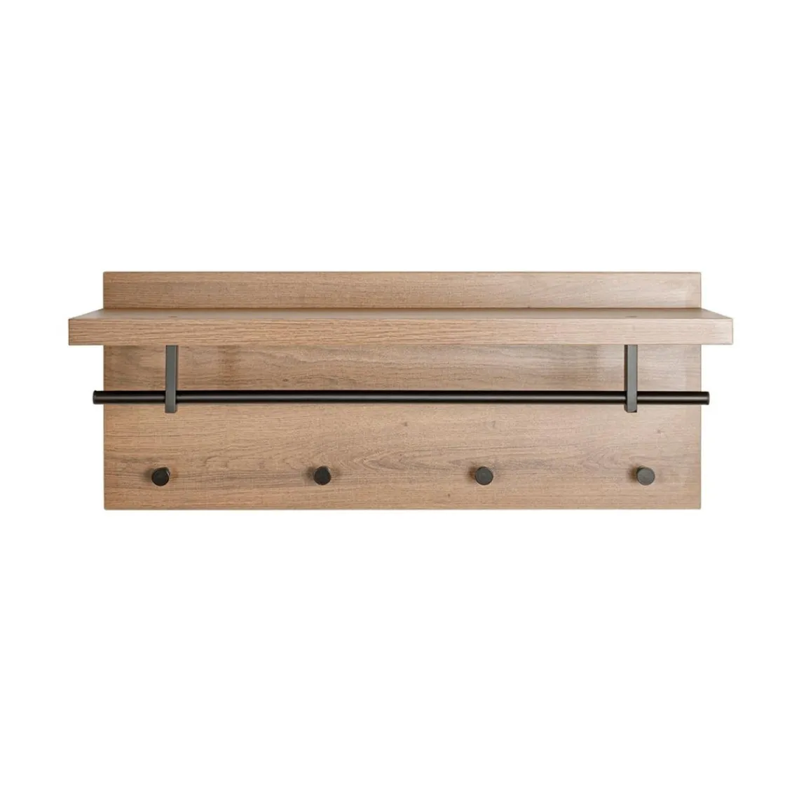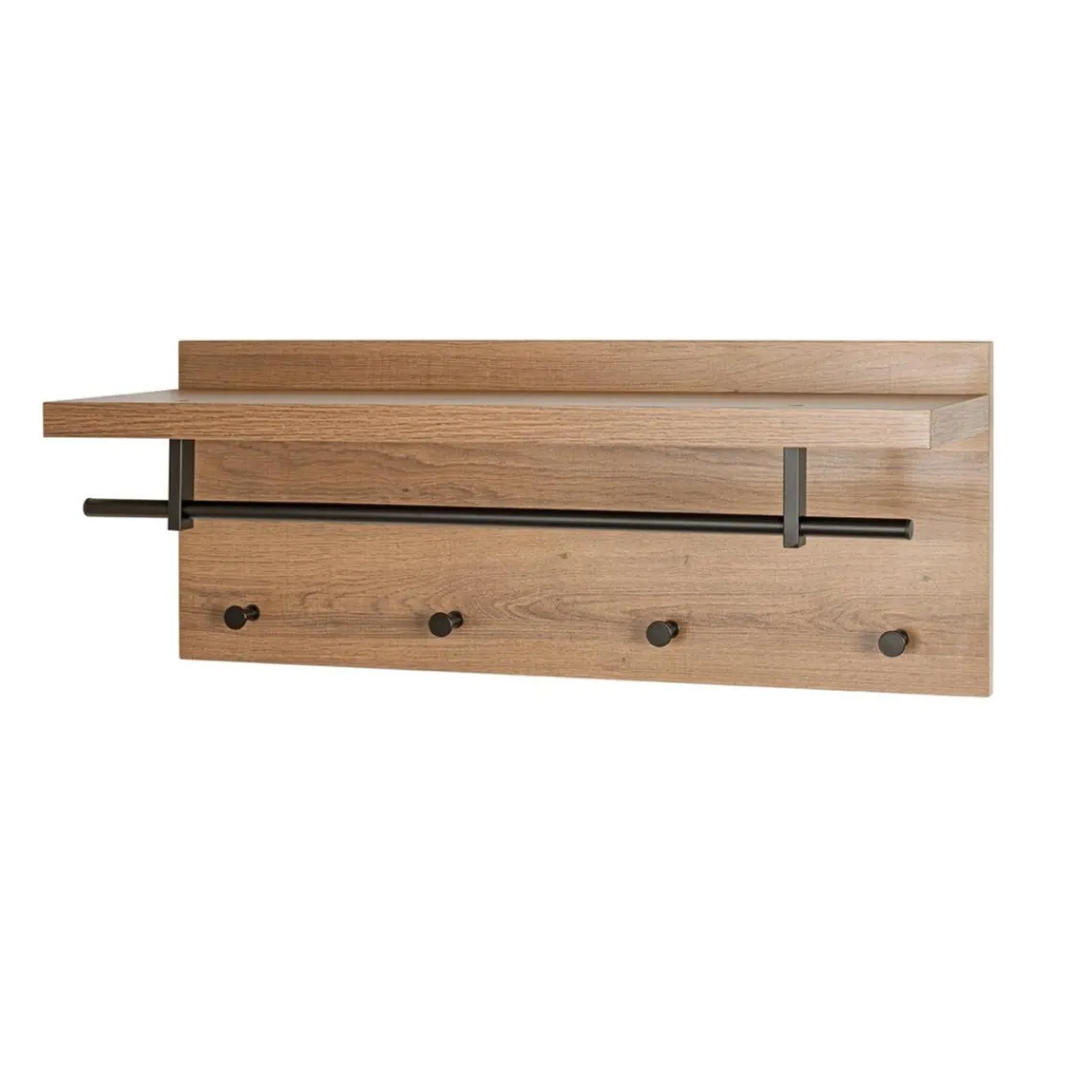 MDF décor chêne, tringle et crochets en métal laqué noir, avec porte chapeau