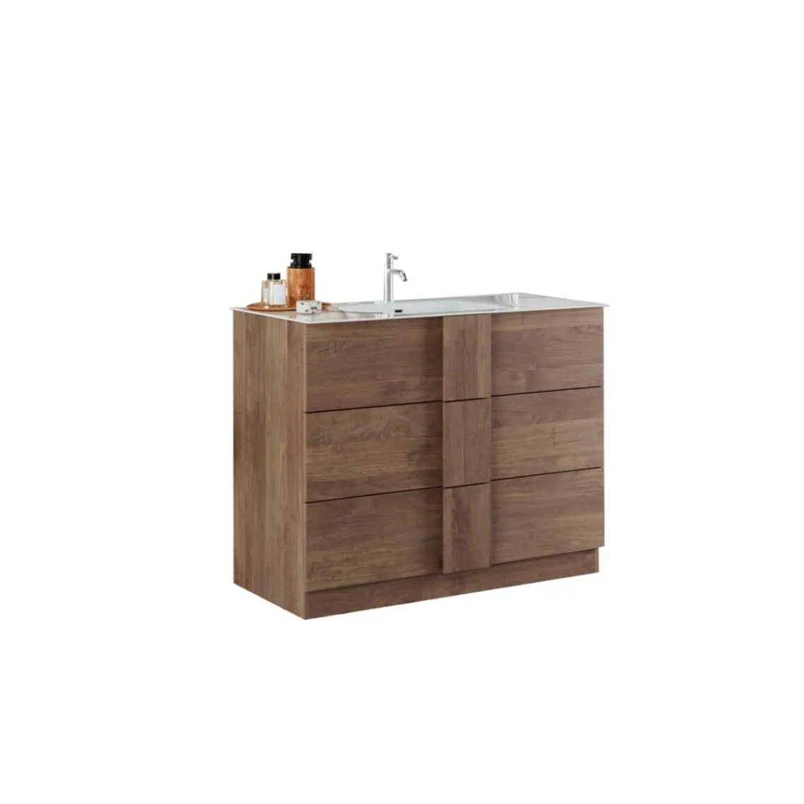 Le meuble de salle de bain Jessie de la marque 3S. x Home est un véritable atout pour votre intérieur. Ses pieds coloris Chêne Mercure lui confèrent un style authentique, tandis que sa structure en contreplaqué (MDF) assure robustesse et durabilité. Il est doté de trois tiroirs spacieux pour un rangement optimal et d’une vasque intégrée en céramique, évoquant une grande élégance. L’ensemble, d’une largeur de 100 cm, se fond parfaitement dans toute salle de bain au style rustique ou moderne.
