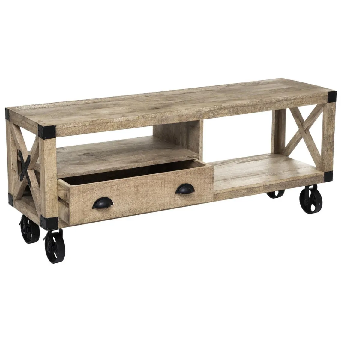 Vous allez adorer l’originalité du design de ce Meuble TV 1 Tiroir SILAS. Sa structure en bois de manguier et son piétement métallique à roulettes attirent de suite les regards.