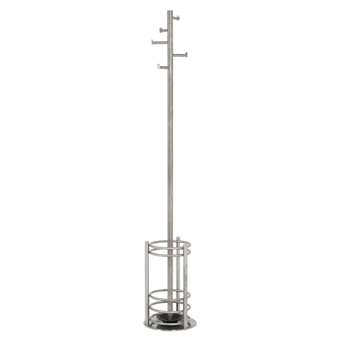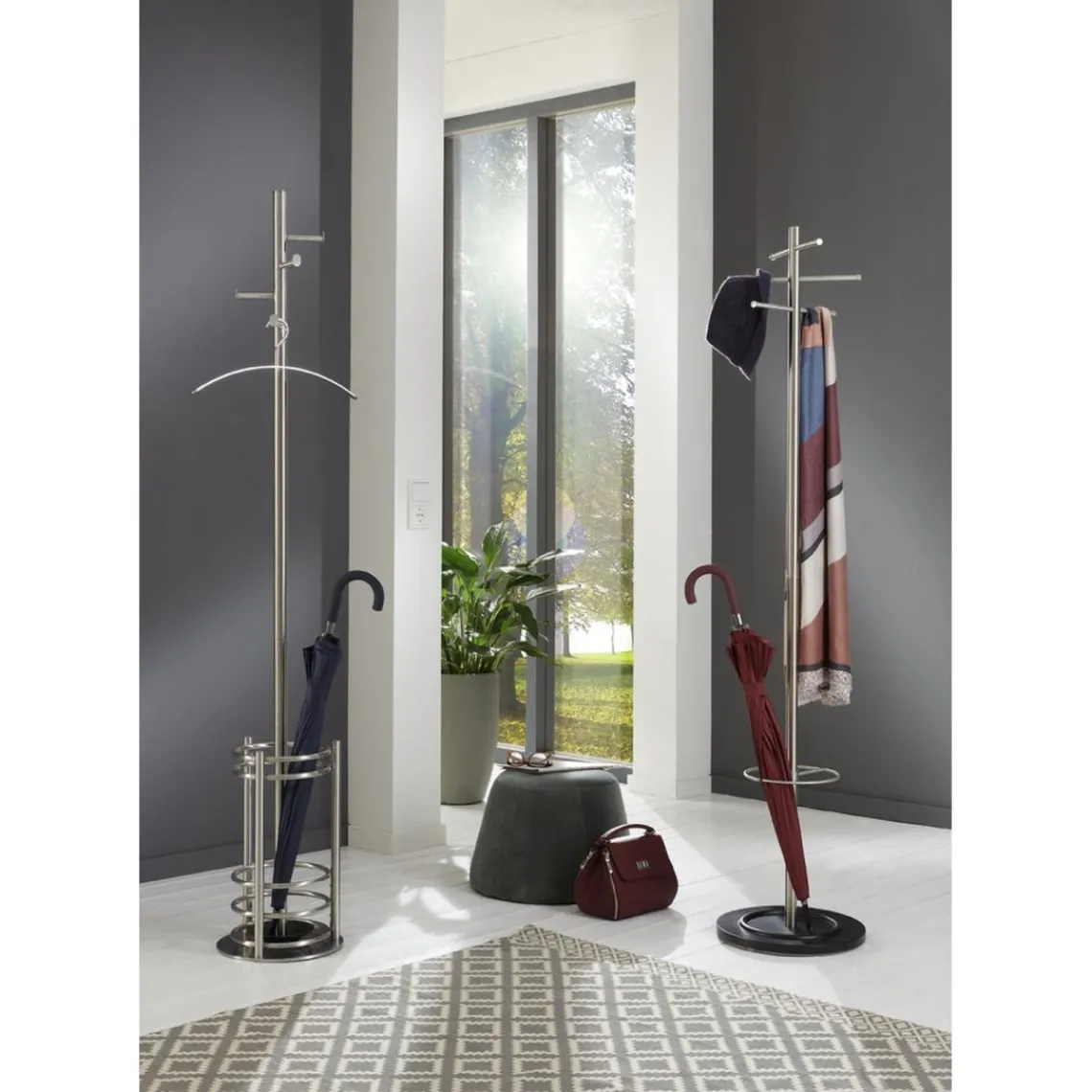 Structure en inox avec 5 crochets, pied en inox massif, porte parapluies intégrée, écuelle en PVC noir Dimensions : 180×30 cm