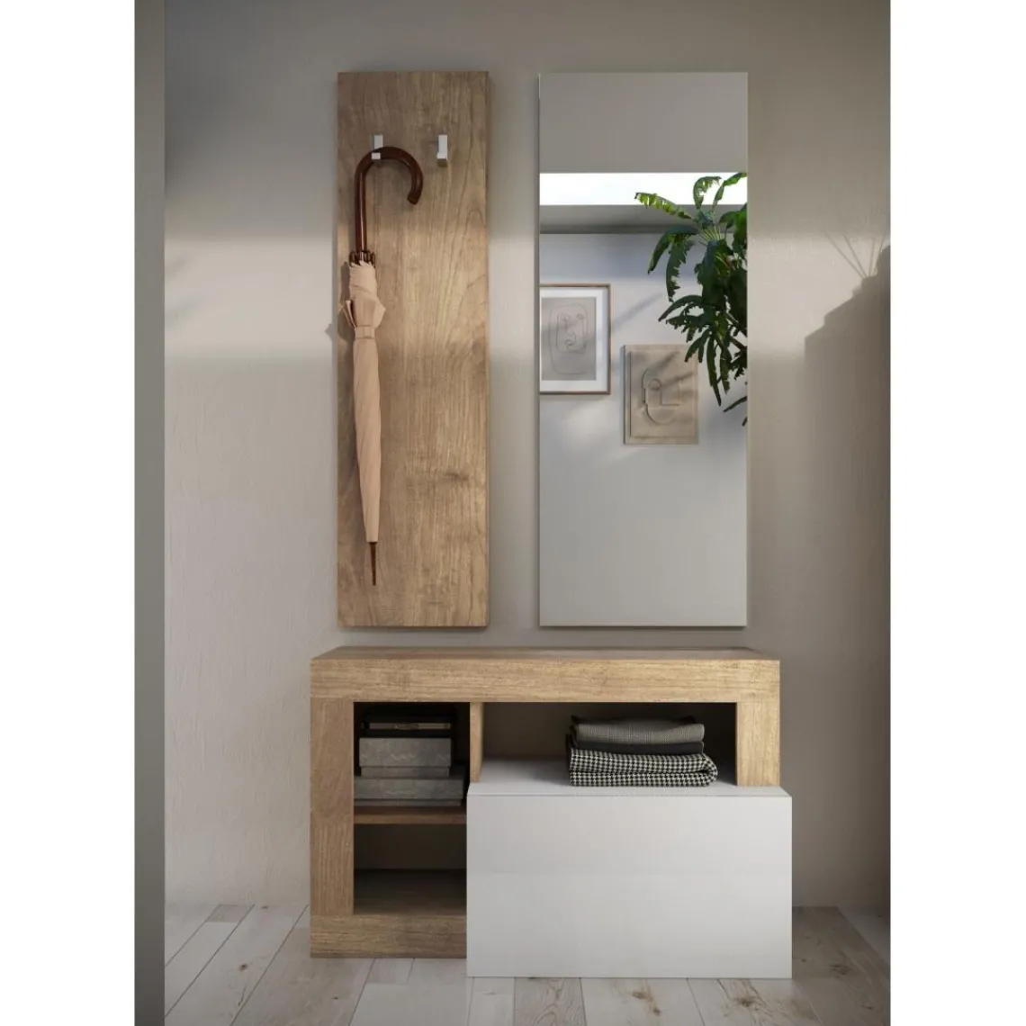 Le set de meubles d’entrée Ancona de la marque 3S. x Home est un assemblage de trois pièces essentielles. Il comprend un meuble à chaussures, un miroir, ainsi qu’un porte-manteau. Le coloris Chêne du bois contreplaqué (MDF) apporte à ce set un style authentique et élégant. Le tiroir, laqué d’un blanc brillant, contraste merveilleusement avec le bois, offrant ainsi une note moderne. La longueur totale de 91 cm rend ce set compact et pratique pour tout type d’entrée.