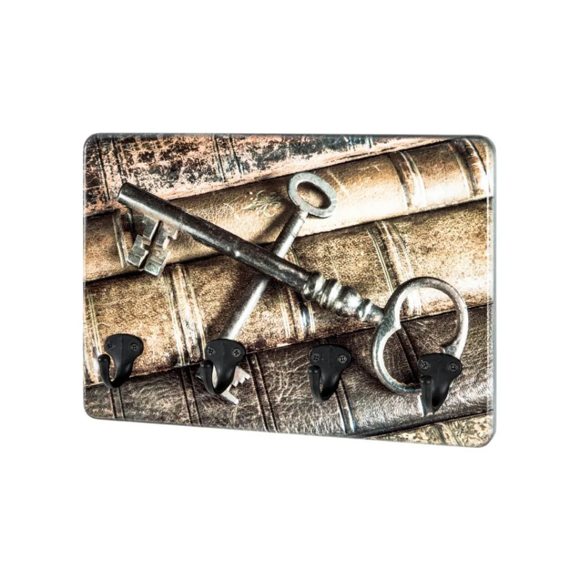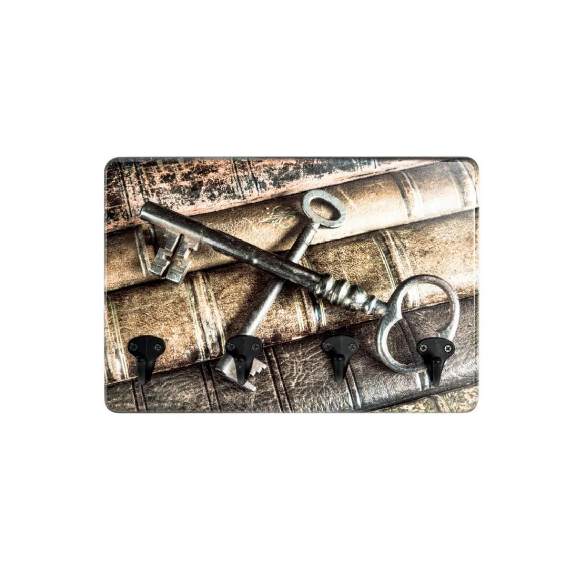 MDF, métal MDF avec impression par Ultra Violet (motif: clés/livres ), 4 crochets clés en métal couleur noir