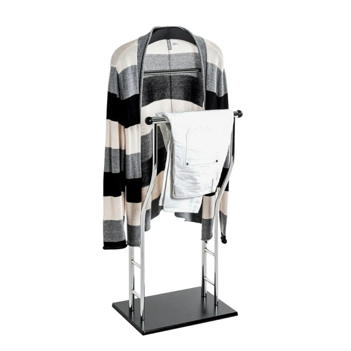 Le Valet de chambre de marque 3S. x Home se démarque par son design minimaliste et son utilité pratique. La structure est fabriquée avec un tube en acier chromé brillant, offrant une stabilité impressionnante. Le cintre laqué en noir et le socle en contreplaqué (MDF) donnent un contraste captivant. La taille compacte et la couleur noire ajoutent de la sophistication à n’importe quel espace, tout en assurant une organisation parfaite de vos vêtements.