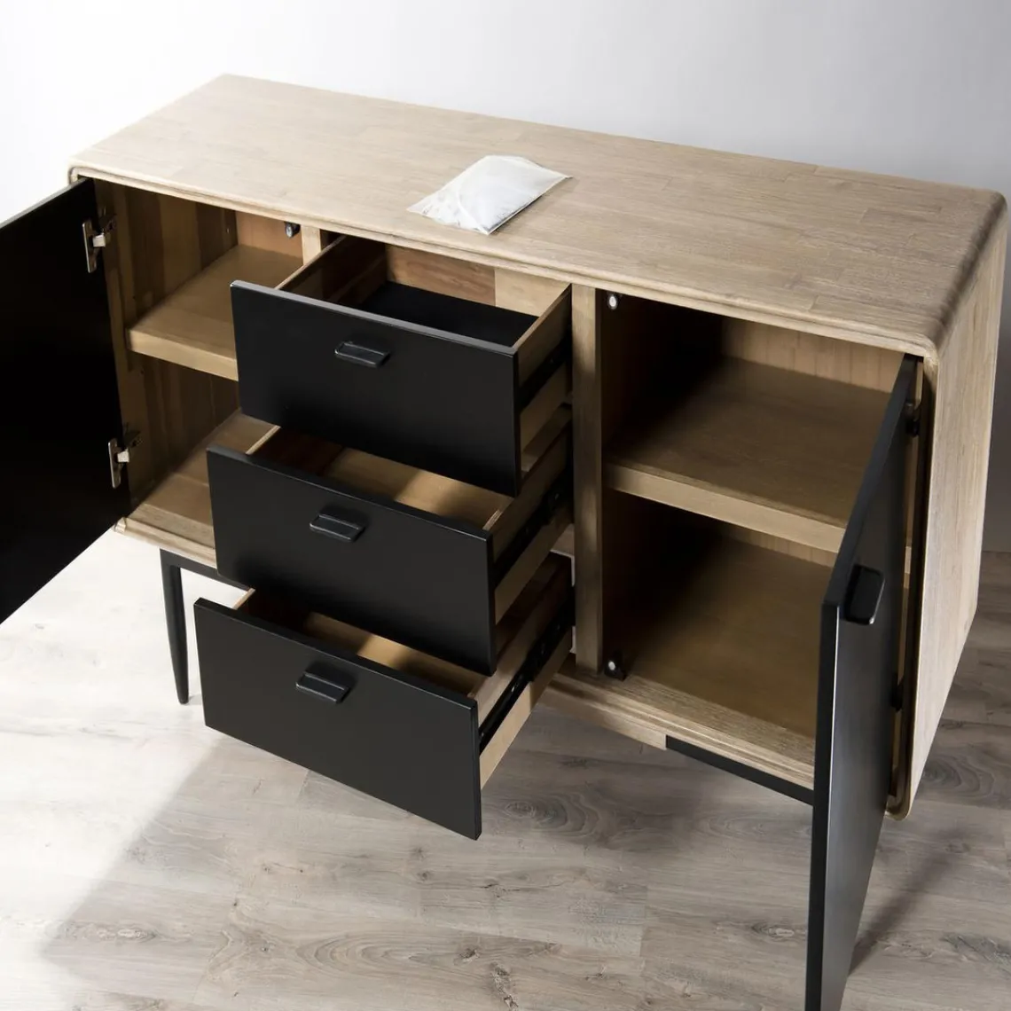Si vous aimez les mobiliers de style scandinave, ce Buffet PALOMA Marron 3 Tiroirs 2 Portes Bois Et Métal est fait pour vous. Il comporte 4 étagères intérieures et des pieds en forme de cône en acier très résistant.