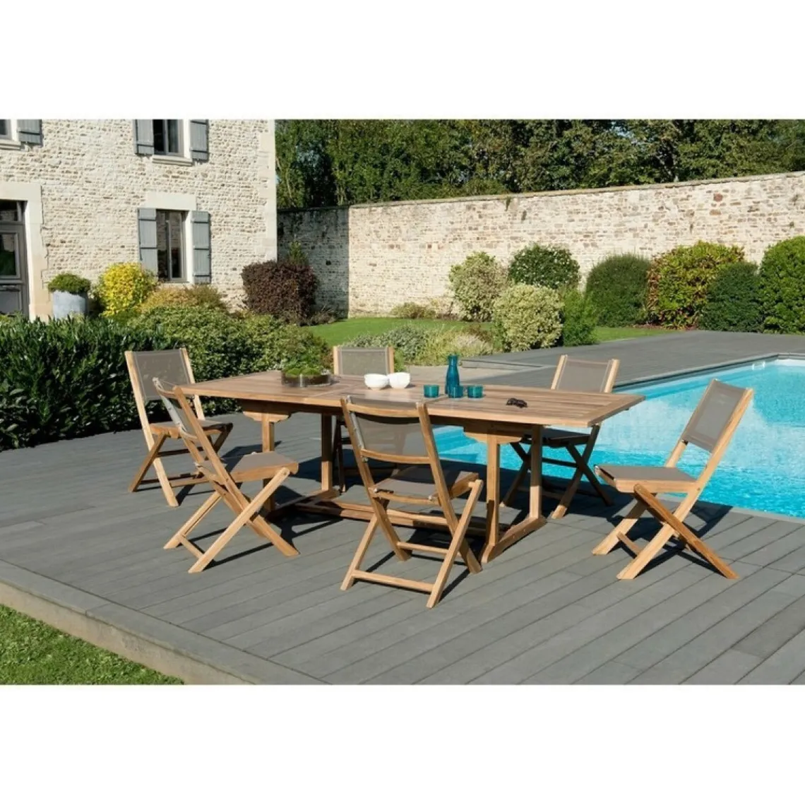 Ensemble table rectangulaire extensible + 6 chaises pliantes en teck massif et textile livré monté, pieds à visser