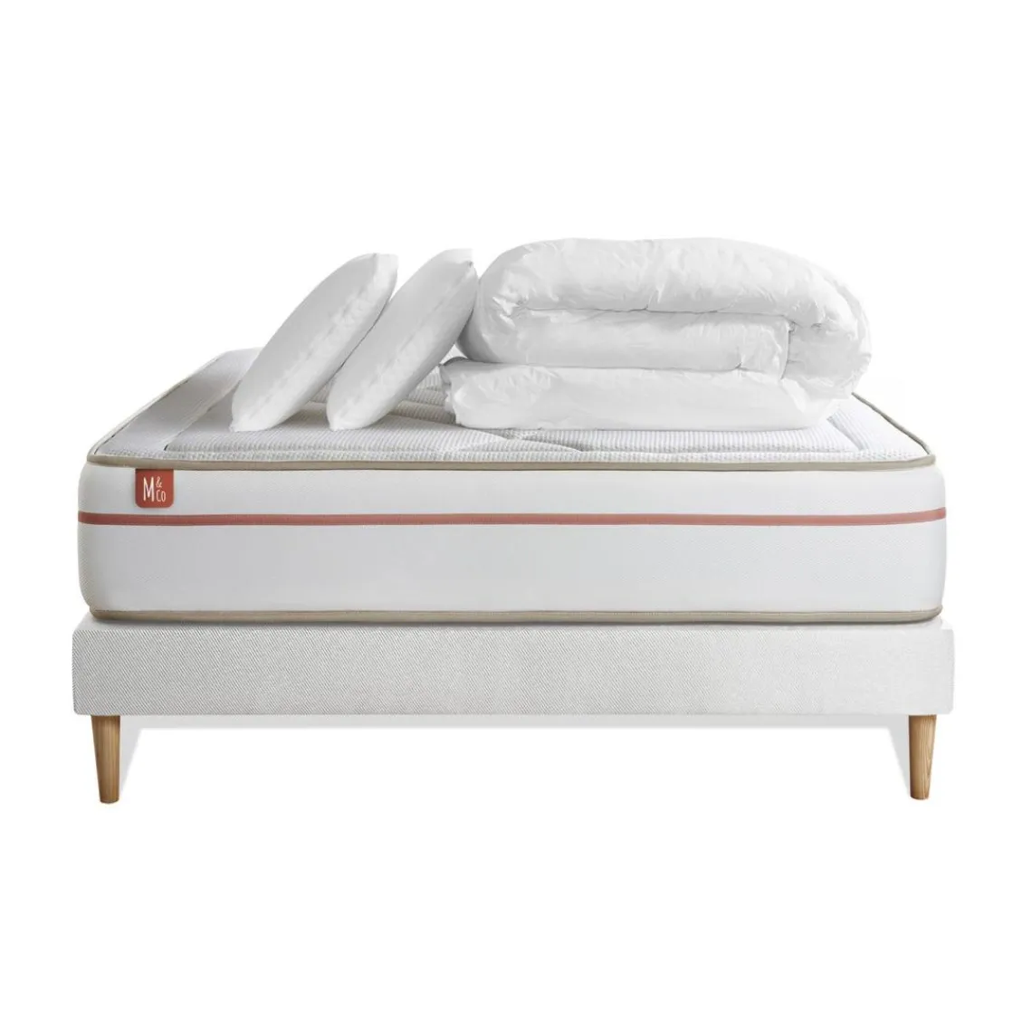 Découvrez le Pack prêt à dormir matelas « LE PAISIBLE » de Marmottes & Co. Doté d’une mémoire de forme BioVisco pour un sommeil réparateur, ce produit vous garantit un confort optimal. Le style authentique de cet ensemble en fait un choix idéal pour ceux qui recherchent une esthétique rustique, mais élégante pour leur chambre. Le coloris blanc épuré du sommier, du matelas, des deux oreillers et de la couette, complété par la matière en tissu, confère à cet ensemble une agréable sensation de chaleur et de douceur. De plus, l’image fournie révèle une finition soignée et minutieuse reflétant le haut-standard de qualité de la marque.